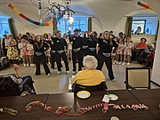 Als unser Zelt stand, die Deko hing und die Küche den Grill draußen aufgebaut hatte, meinte es Petrus gar nicht gut mit uns, so daß wir mit Bierbänken und Biertischen ganz schnell in den Speisesaal umzogen. Das tat der Stimmung aber keinen Abbruch. Unser Showact, der Zirkus Dumbo zog einfach den Kopf ein und das Programm wurde ins Foyer verlegt. Da machte sogar unsere Einrichtungsleitung Freudensprünge, zu denen sie vom Clown angefeuert wurde. Es war ein sehr vergnüglicher Nachmittag und zum Abschluß ließen wir uns die vielen selbstgemachten Torten und Kuchen, diesmal von unserer jetzigen Küchenleitung, Herrn Harms, schmecken.